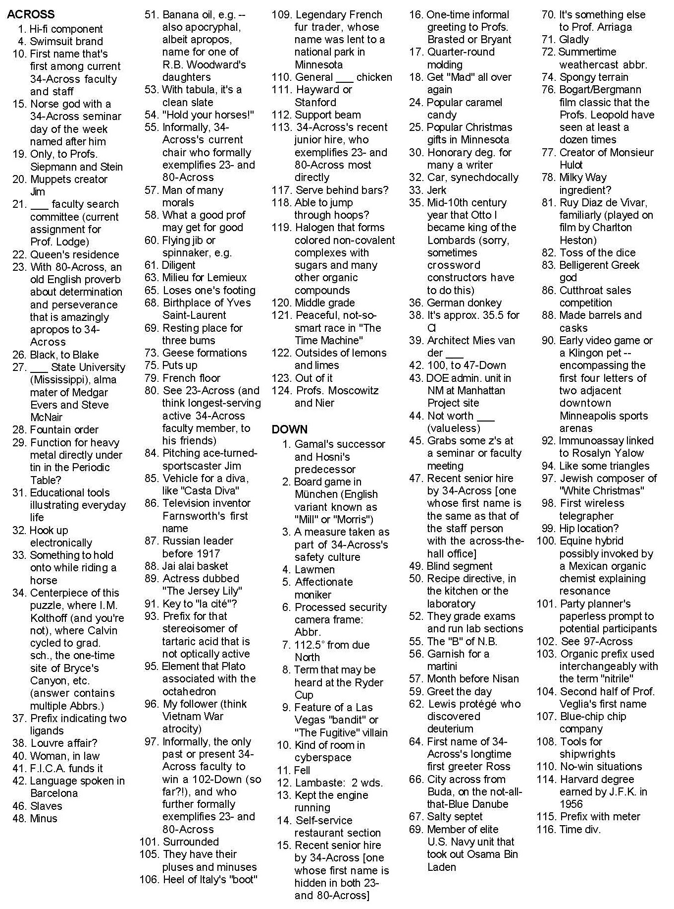 First Names Firstby George Barany and FriendsThis Sunday-sized puzzle was distributed at a 34-Across social event. After completing the puzzle (spoiler), learn more about the puzzle by clicking here for our "midrash." Click here (two pages) or here (one page, for those with good eyesight) to view or download this Sunday-sized puzzle in PDF format; here to download it as a puz file; here to download it as an ipuz file [requires the free Puzzazz app to solve]; here to solve the puzzle interactively (thanks to Jim Horne); here for the solution. The author thanks the following (in alphabetical order) for "vetting" the puzzle: Jed Fisher, Ben Geisbauer, Michael Hanko, Martin Herbach, Ken Leopold, Kathy Peters-Martell, Paul Schoenholz, Chuck Tomlinson, and Letitia Yao. If you want to tell others about this particular page, refer them to More puzzles here (all), here (science), and here (tributes). E-mail barany@umn.edu to be added to a bcc distribution list . |