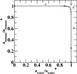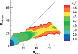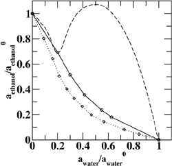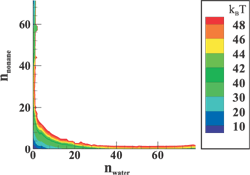 (Top left) Contours of the two-dimensional nucleation free energy surface as a function of the number of water and ethanol molecules calculated for an equimolar gas mixture. (Top right) Contours of the two-dimensional nucleation free energy surface as a function of the number of water and n-nonane molecules calculated for a nonane-rich gas mixture. (Bottom left) Comparison of the reduced onset activities for binary nucleation of water/ethanol mixtures at 260~K: experimental data (dotted line and diamonds), CNT predictions (dashed line) [Viisanen, Y.; Strey, R.; Laaksonen, A.; Kulmala, M. J. Chem. Phys. 1994, 100, 6062-6072], and simulation results (solid line and circles). (Bottom right) Comparison of the reduced onset activities for binary nucleation of water/n-nonane mixtures at 230~K: experimental data (circles), predictions using the nucleation theorem (dashed line) [Wagner, P. E.; Strey, R. J. Phys. Chem. B 2001, 105, 11656-11661], and the simulations results (solid line). |
