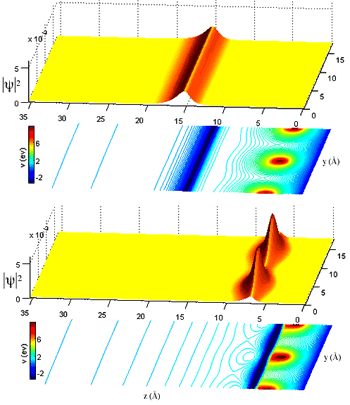 The potential field (V) and the resulting electron density (|Ψ|2) for the n = 1 image state on Cu(111) covered by 1 (lower) and 2 ML C60 (upper); z is distance from the metal surface and y is lateral distance along thecrystal direction of Cu. |