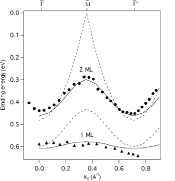 A comparison of experiments with theory: Parallel dispersions of the n = 1 image state on Cu(111) covered by 1 ML (triangles) and 2 ML C60 (circles) are obtained from angle-resolved two-photon photoemission spectroscopy. k|| is the parallel momentum vector. Dashed curves are theoretical results from a zeroth order model neglecting molecular corrugation and solid curves are from a more realistic model including molecular corrugation. |