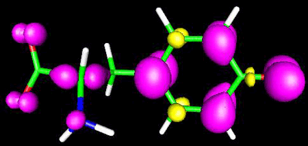 Figure Caption Delocalized spin density of a tyrosyl radical calculated with density-functional theory at the Minnesota Supercomputing Institute. | |