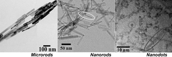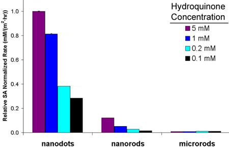 Department of Chemistry, University of Minnesota Nanoparticle reactivity is critically important to the geochemical cycling of both natural and anthropogenic chemical species. Iron oxides and oxyhydroxides are common and important materials in the biogeochemical cycle of iron and other metals and molecular species at the Earth's surface. These materials commonly occur as nanoparticles in the 3-10 nm size range (e.g., goethite nanoparticles as in Penn et al., Geology, 2000). Our work shows that the rate of redox using hydroquinone as the reducing agent and iron oxyhydroxide nanoparticles as reductant is strongly particle size and phase dependent. For example, redox reactions using ~3.5 nm 6-line ferrihydrite nanoparticles, ~9x70 nm needle-shaped goethite nanoparticles, and ~30x350 nm needle-shaped goethite particles (figure 1) show that the surface-area normalized rates of redox are fastest (by as much as 100x) in experiments using the 6-line ferrihydrite. Furthermore, the surface-area normalized rates of redox for the ~9x70 nm needle-shaped goethite nanoparticles is up to fourteen times faster than the rates of redox for the ~30x350 nm needle-shaped goethite particles (figure 2). |