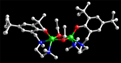 ![]() X-ray crystal structure of the new lactide polymerization catalyst, (L1ZnOEt)2. Zn atoms are green, nitrogen atoms blue, oxygen atoms red, and carbon atoms gray. |