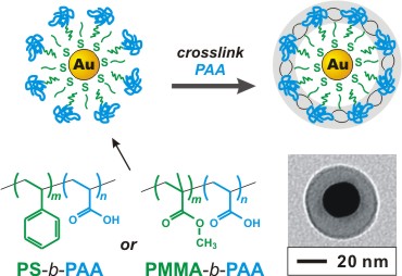 Figure 1. Encapsulation of Au nanoparticles within crosslinked, block-copolymer shells. The polyacrylate block is crosslinked with a diamino-oligo(ethylene oxide), which imparts broad solubility to the particles. In principle, any glassy block can be used in the core, and the specific polymer used dictates which solvents permeate the shell and which do not. |