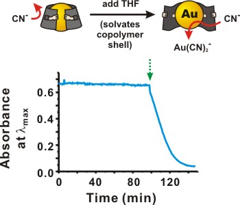conditions ( However, in solvents that normally dissolve polystyrene, the glassy polymer block swells with solvent, and the cloak becomes suddenly (though reversibly) permeable. In this way, molecules that have been excluded from the nanoparticle core, like the cyanide etchant shown in the figure below, can suddenly access the particle surface. As THF swells the hydrophobic polymer, it carries dissolved cyanide with it and, in this case, dissolves away the encapsulated particle. In general, crosslinked polymer shells could be useful not only to protect sensitive particles, but also to control access of catalytic nanoparticles to substrates, or of sensing particles to analytes. |