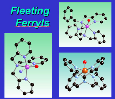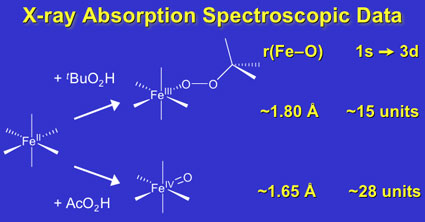 In a paper recently published in the Journal of the American Chemical Society, postdoctoral associate Jan-Uwe Rohde and co-workers in the group of Professor Lawrence Que report X-ray absorption spectroscopic studies of mononuclear low-spin alkylperoxoiron(III) and oxoiron(IV) complexes (published online as an ASAP article on December 2, 2004). These highly reactive species model intermediates proposed in the activation of dioxygen by nonheme iron enzymes. The biomimetic complexes have been generated by oxidation of synthetic iron(II) complexes of neutral tetradentate (TPA) and pentadentate (N4Py, Bn-TPEN) ligands. Notable trends observed are Fe-O bond lengths of ~1.78 Å for the Fe(III)-OOR intermediates and ~1.65 Å for the Fe(IV)=O intermediates, reflecting different strengths in the Fe-O p interactions. The intensities of the 1s-to-3d transitions also increase from 4 units for the nearly octahedral Fe(II) precursor to 9 - 15 units for the Fe(III)-OOR intermediates to 25 - 29 units for the Fe(IV)=O species, reflecting increasing distortion from centrosymmetry. This is the first systematic structural study of a series of iron intermediates related to mononuclear nonheme iron enzymes. |