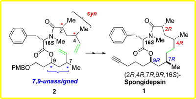 Collected in Australia, and isolated in Italy, the complete structure of 1 was fully established in Minnesota. For this, a stereodivergent total synthesis strategy that features macrocycle formation via ring closing metathesis (RCM) as the key step was employed. The stereochemical determination strategy relied upon the preparation of all eight possible diastereoisomers of the macrolide-containing portion of spongidepsin incorporating (S)-N-methylphenylalanine. These include both (2S,4S)- and (2R,4R)-enantiomers of the syn-2,4-dimethyl moiety conjoined with the four diastereomeric combinations of (R,S)-isomers at C7 and C9. Comparison of the spectral data of each of the diastereomeric probes with those of natural spongidepsin indicated that a specific isomer was to be selectively advanced to the total synthesis of 1. The 13-membered macrolides were prepared by RCM of dienes 2 and subsequent alkene hydrogenation. The RCM substrates 2, in turn, were derived from syn-2,4-dimethyl and C7,C9-containing fragments representing C1-C5 (4) and C6-C11 (3) of 1, respectively. The two enantiomers of syn-2,4-dimethyl carboxylic acid 4 are derivable from acetate-alcohol 6, which was provided by Jianyan Xu, via alternative manipulations of the terminal functional groups. Each of the four stereoisomers of 3 originated from the known L-malate-derived epoxide 5 bearing a C9 stereogenic center. |