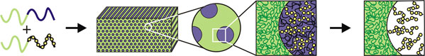 In recent work carried out by Huiming Mao, Pedro L. Arrechea, Travis S. Bailey, and Bret J. S. Johnson, in Marc A. Hillmyer's laboratories, new water-compatible nanoporous plastics were prepared using a degradable block copolymer strategy. These materials have potential uses as nanoscopic templates, filtration media, and high surface area catalyst supports. In this project ordered nanoporous plastics with hydrophilic pore surfaces were prepared by the degradative removal of polylactide from a self-organized, multi-component composite containing two block copolymers: polystyrene-polylactide and polystyrene-polyethylene oxide (see Figure). The solid-state characterization of blends containing up to 12 wt% polyethylene oxide was consistent with nanoscopic cylinders of mixed polyethylene oxide and polylactide hexagonally packed in a polystyrene matrix. Orientation of these materials through simple channel die processing resulted in good cylinder alignment. Subsequent methanolysis/hydrolysis of the polylactide component gave nanoporous polystyrene with polyethylene oxide coated pores. The resulting nanoporous materials were able to imbibe water, in contrast to nanoporous polystyrene with no polyethylene oxide component. |
