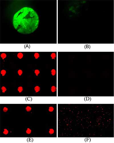 ![]() Figure 2 Fluorescence microscope images of: (A) 6xHis-GFP and (B) GFP on the Cu2+-IDA-mPEG-Si surface (C) purified 6xHis-STa-IV on the Cu2+-IDA-mPEG-Si surface; and (D) background test which involves spotting 6xHis-STa onto a DEIDA-mPEG-Si surface after pre-treatment with CuSO4 solution. (E) crude lysate containing 6xHis-STa-IV on the Cu2+-IDA-mPEG-Si surface; and (F) background test which involves spotting of crude lysate containing 6xHis-STa-IV onto the DEIDA-mPEG-Si surface after pre-treatment with CuSO4 solution. |