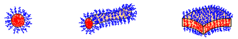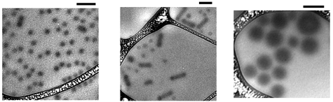 Cryo-transmission electron micrographs of micelles formed by a polystyrene-polyisoprene block copolymer, with block molar masses of 13,000 and 71,000 g/mol, respectively,dissolved at 1% concentration in various dialkyl phthalate solvents. Scale bar is 200 nm. Cartoons indicate the chain packing within the various structures. |