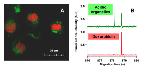 Scientists have speculated that acidic organelles (lysosomes and endosomes) sequester drugs that are weak bases (e.g. doxorubicin, pKa ~8.4) because they become protonated when they enter the lumen of an acidic organelle (e.g. pH < 6). If this process occurs in a cancer cell, the acidic organelle contributes to eliminate the drug from this cell, which ultimately leads to the cell’s survival and cancer drug resistance. In a recent accelerated article published by Analytical Chemistry (77, 2281–2287, 2005), Yun Chen, Richard Walsh and Edgar Arriaga report on the detection and quantification of the anticancer drug doxorubicin in individual acidic organelles. The investigators used as models human leukemia cell lines that engulf (endocytose) fluorescently-labeled nanospheres into acidic organelles and then treated these cells with doxorubicin. Using confocal fluorescence microscopy, the investigators were able to identify the position of acidic organelles (Green domains in Figure 1A), but doxorubicin (red domain in Figure 1A) did not colocalize in acidic organelles and was mainly localized in the nucleus. In contrast, when these researchers used capillary electrophoresis with laser-induced fluorescence detection (CE-LIF) they were able of separating and detecting individual events associated with acidic organelles containing doxorubicin (e.g. event detected simultaneously in the two channels of the LIF detector, Figure 1B) and other acidic organelles that did not contain doxorubicin (e.g. event detected only in acidic organelle channel). After calibration of this detector, they found out that on average acidic organelles contain ~ 10-20 mole doxorubicin per organelle. This is the lowest measured amount of a fluorescent drug associated with acidic organelle sequestration. |