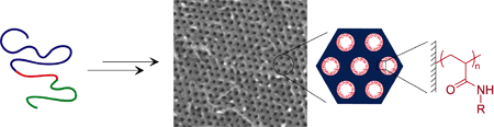The synthesis of nanoporous materials with well-defined pore sizes and surface properties is essential for their use in applications based on selective adsorption and interfacial chemical processes, such as affinity chromatography and heterogeneous catalysis. Research efforts in Professor Marc Hillmyer’s group toward this end have culminated in a new class of nanoporous materials enabling such control. Dr. Javid Rzayev, a postdoctoral fellow working with Professor Hillmyer, has shown that chemically-etchable ABC triblock copolymer precursors can be used for the fabrication of nanoporous matrices with controlled interior surface properties (J. Am. Chem. Soc. 2005, 127, 13373). In a polystyrene-poly(N,N-dimethylacrylamide)-polylactide (PS-PDMA-PLA) triblock copolymer, PS constitutes the matrix, PDMA provides functionality on the interior pore surfaces, while PLA is a sacrificial minority component. The flow alignment of the self-assembled triblock copolymer samples and subsequent removal of PLA cylinders provided a nanoporous, glassy PS matrix containing hexagonally packed array of channels coated with hydrophilic PDMA (see Figure).
