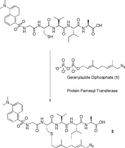 Incorporation of an azide into a peptide and subsequent Staudinger ligation reaction These results demonstrate the ability to enzymatically incorporate prenyl azide groups into a peptide substrate using PFTase, and subsequently modify the peptide using a Staudinger ligation reaction. Therefore, it should be possible to site-specifically modify any protein with a CaaX tetrapeptide engineered onto its C-terminus. This strategy may be useful for several applications in protein chemistry, including biophysical probe incorporation and surface attachement. 1) Saxon, E.; Berozzi, C. R. Science 2000, 287, 2007-2010 |