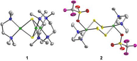 Copper-sulfur interactions play a critical role in the function of several classes of biological molecules, with the soft, polarizable nature of sulfur being uniquely suited for modulating the electronic structure and reactivity of copper protein active sites. For example, electronic delocalization has been postulated to be a role played by the inorganic sulfur recently identified in the "CuZ" site of nitrous oxide reductase (Figure 1), a key enzyme involved in the environmentally important process of biological denitrification. In order to gain insight into the properties of the unique CuZ catalytic cluster, N-donor ligand supported copper-sulfur chemistry needs to be developed. ![]() Figure 1.Depiction of the CuZ site in nitrous oxide reductase from its X-ray crystal structure (PDB 1FWX). In efforts toward this aim, postdoctoral associate Dr. Eric Brown and graduate student John York in the laboratory of Professor William Tolman have recently succeeded in preparing two novel complexes 1 and 2 (Figure 2), which have been found to have unusual electronic structures through spectroscopic and theoretical studies. 1,2 Compound 1 features three copper ions capped by sulfides, a motif that models structural attributes of the CuZ site. The [Cu3(μ-S)2]3+ core has a formal oxidation state description of Cu(II)2Cu(III), but in contrast to a previously reported analog with oxides instead of sulfides that has a localized mixed-valent electronic structure, 3 1 was determined to be fully delocalized on the basis of low temperature X-ray crystallography and EPR spectroscopy. Theoretical calculations performed by collaborators E. Ruiz and S. Alvarez at the University of Barcelona rationalize this intriguing result. Complex 2 forms under slightly different reaction conditions, and features a [Cu2(μ-1,2-S2)2]2+ core in which the S-S bonds remain intact. This core may be envisoned as either (a) two Cu(III) ions bridged by disulfides (S22-), or (b) two Cu(II) ions bridged by disulfide(-) ions (S2-). It was concluded that the latter description (b) is correct on the basis of X-ray crystallographic and resonance Raman spectroscopic measurements. Current work is focused on assessing the redox chemistry of 1 and 2 and on further developing new copper-sulfur complex motifs. ![]() Figure 2. The X-ray structures of (left) the cluster 1, [(TMEDA)3Cu3(μ-S)2]3+, and (right) the complex 2, [(TMEDA)2Cu2(S2)2(O3SCF3)2], with all nonhydrogen atoms shown as 50% thermal ellipsoids. Atom colors are: Cu, green; S, yellow; N, blue; O, red; F, purple. TMEDA = N,N,N',N'-tetramethylethylenediamine. References |